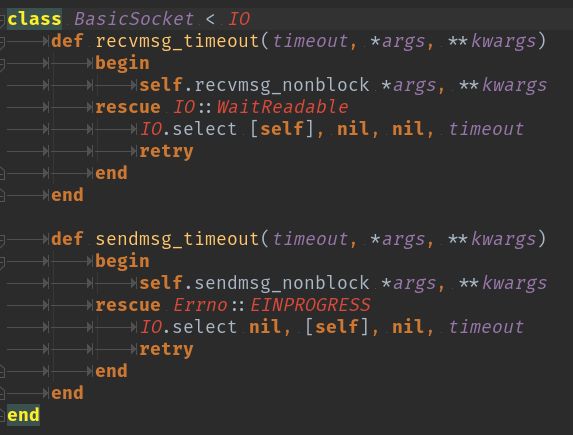Toutes les primitives un peu plus haut niveau de Ruby (connect, recvmsg, sendmsg…) ont juste bouffé le paramètre de timeout… Donc si tu veux pouvoir le gérer… faut réimplémenter 😭