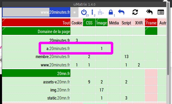 Mais en fait, c’est parce que je suis un extrémiste et que j’ai µMatrix… Si on active 20mn.fr, on voit un nouveau sous-domaine apparaître. Coucou la régie pub ! On a donc un site tiers pas tiers qui charge un site pas tiers tiers… 😱