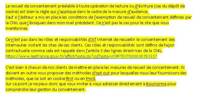 Coucou @CNIL : reçu une réponse d’AT Internet à l’instant. Ne serait-ce pas le même problème que Teemo & cie, à savoir que des boîtes tierces proposent des solutions à leurs clients sans fournir de solution d’opt-in/out ni vérification de la collecte réelle du consentement avant