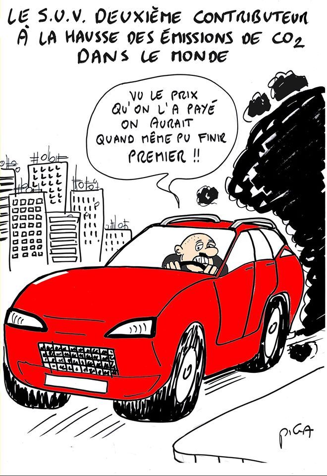 : L'individualisme motorisé x 4x4. Dessin par Piga. #stopSUV #transports #transitionEnergetique