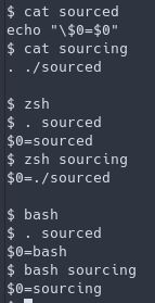 $0 fonctionne si le fichier est sourcé directement depuis un shell intéractif, mais plus du tout quand sourcé depuis un autre script… 🤔