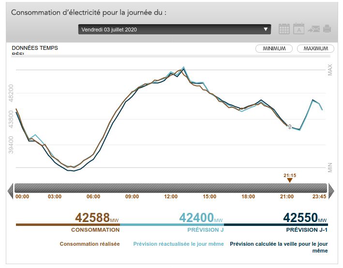 @Changelamonnaie @eric_patris @stmanfr @Francois_Ruffin Et pour aujourd’hui à 21h15 très précisément, on consommait bien strictement notre production. 42588MW de consommation, 138+12+3130+8353+29378+209+2940+757= 44917MW de production auxquels il faut soustraire les 161 de STEP+2168 d’export = 42588MW.