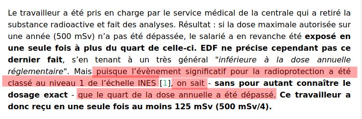 @TristanKamin Hello ! Pourrais-tu confirmer que l’échelle INES de niveau 1 correspond à un dépassement de la quart de dose annuelle ? Je n’avais jamais entendu parlé de la moindre corrélation entre dose et niveau INES… 🤔