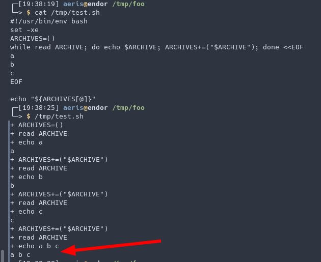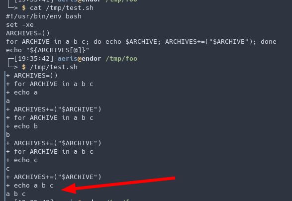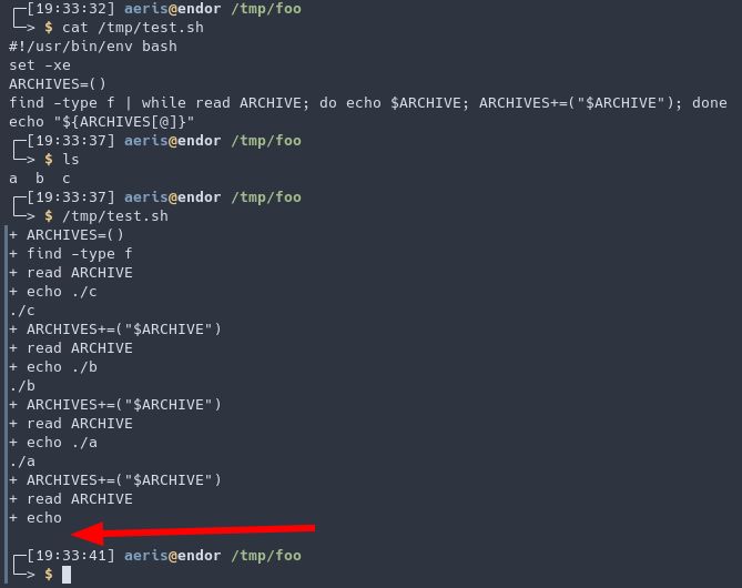 La réponse semble être : dans 2 cas le « while » n’est pas un sous-shell et donc ARCHIVES est bien le même objet dans et hors de la boucle. Dans le 3ème avec un |, c’est un sous-shell et donc ARCHIVES dans la boucle n’est pas le même qu’en dehors de la boucle. Le tableau n’est