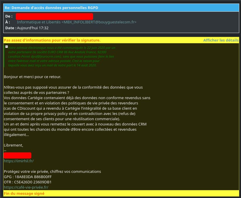 1. Le RGPD, ou « comment tout le monde n’en a strictement rien à battre »… On a quand même une boîte qui viole le RGPD en revendant sa base client, une autre qui viole 2× le RGPD en ne vérifiant pas ses données d’entrée et en les refourguant par la suite, et une dernière qui