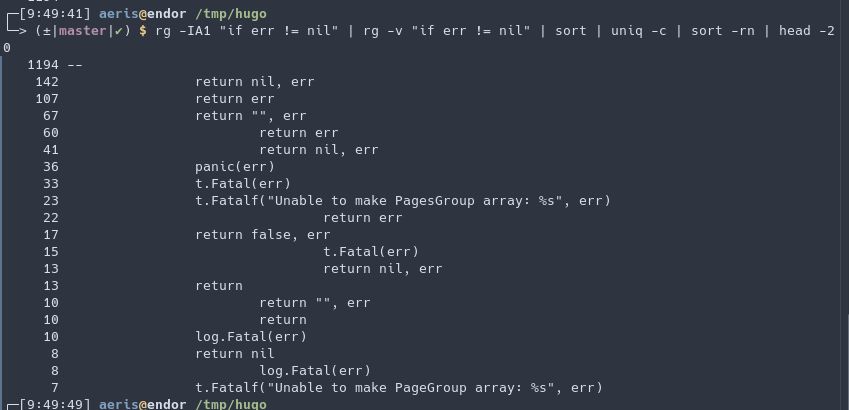 @ugobourdon @LupusMichaelis Et le problème c’est que la pratique donne tord à go. Sur le top 20 des gestions d’erreur de la codebase go, c’est du passe-plat d’erreur sans traitement possible, et ça représente au moins 54% des cas @aeris22/1306268852741984256