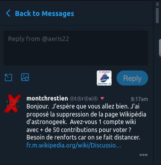 Non mais vous êtes sérieux les gens ? Du spam Twitter pour spammer des demandes de suppression Wikipedia pour virer @AstronoGeek de là-bas ? Sérieusement ? 🤔