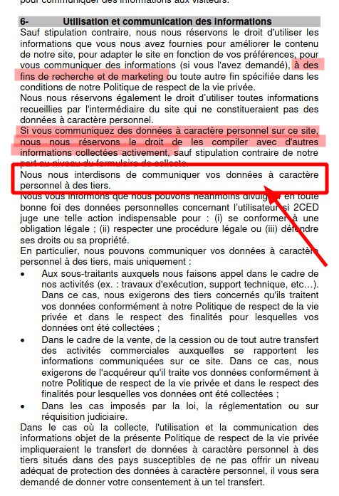 Alors, on commence. Les trucs surlignés en rouge sont illégaux. Tout ça relève du consentement explicite, spécifique, libre et éclairé. Donc. Et le pire, vous voyez votre petit § encadré en rouge ? #Suspens cc @CNIL