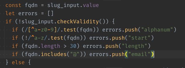 Niveau HTML ? Ben on a du HTML 5 maintenant, qui gère ça nativement. Donc <input required="required" pattern="[a-z][a-z0-9]{0,29}"> Géré nativement par HTML. En JS on fait un input.checkValidity() et c’est marre. C’est tout niquel. Parfait. Vous sentez venir la suite ? […]