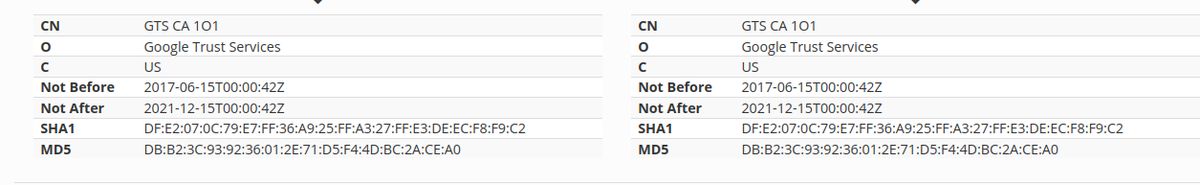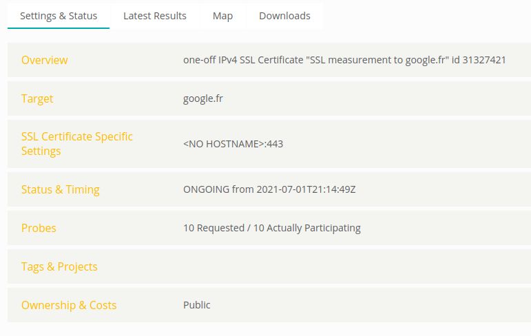 @rkurt @bortzmeyer @manhack @laurentchemla @tcitWorld @MaisOuVaLeWeb @RIPE_Atlas @ANSSI_FR @shodanhq @torproject Là par exemple je viens de demander à 10 sondes au pif de me filer les données TLS pour google.fr