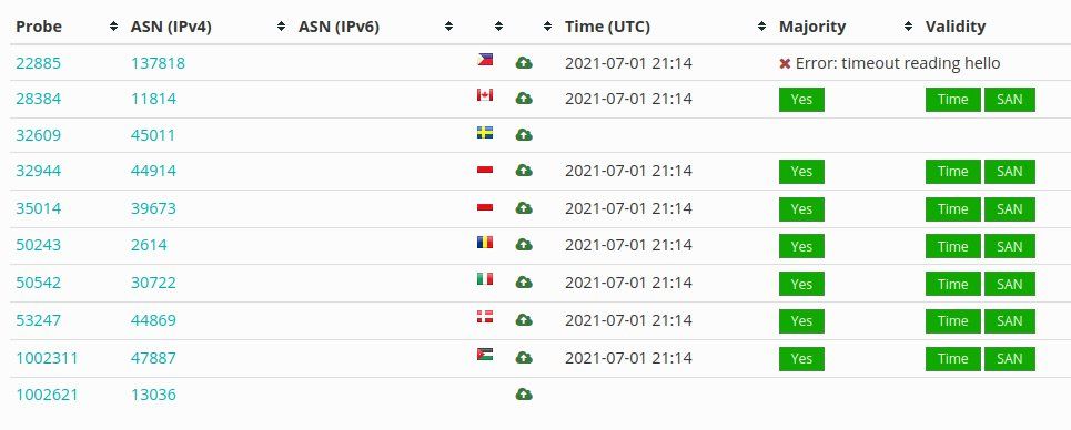 @rkurt @bortzmeyer @manhack @laurentchemla @tcitWorld @MaisOuVaLeWeb @RIPE_Atlas @ANSSI_FR @shodanhq @torproject Et pour chaque sonde j’ai le certificat vu par la sonde.