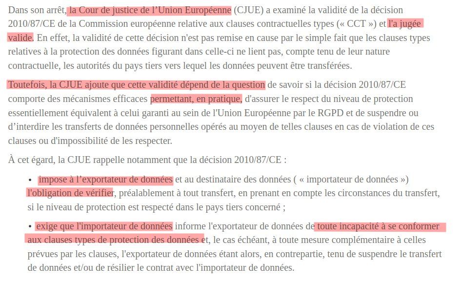 @MonsieurRelou En fait c’est même tout le sens de la décision de la CJUE. Les CCT/BCR sont des moyens valides d’atteindre la conformité MAIS elles doivent de toute façon être mises dans le contexte spécifique du transfert pour en juger de leur pertinence.