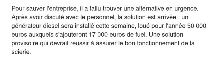 Pour sauver une entreprise de la hausse du coût du gaz qui pollue la planète, on pollue encore plus la planète avec du fuel… La réalité et la folie du capitalisme actuel… france3-regions.francetvinfo.fr/pays-de-la-loire/mayenne/laval/villaines-la-juhel-en-mayenne-face-aux-prix-eleve-de-l-electricite-une-scierie-tourne-avec-son-propre-groupe-electrogene-2417323.html