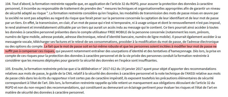 @MonsieurRelou Pour Free, faut lire un peu plus entre les lignes, mais ça revient à dire « vous devez implémenter l’état de l’art, sinon vous êtes forcément à côté de vos pompes » legifrance.gouv.fr/cnil/id/CNILTEXT000044810599