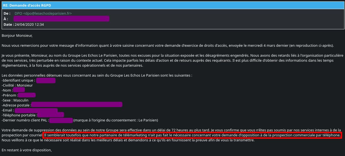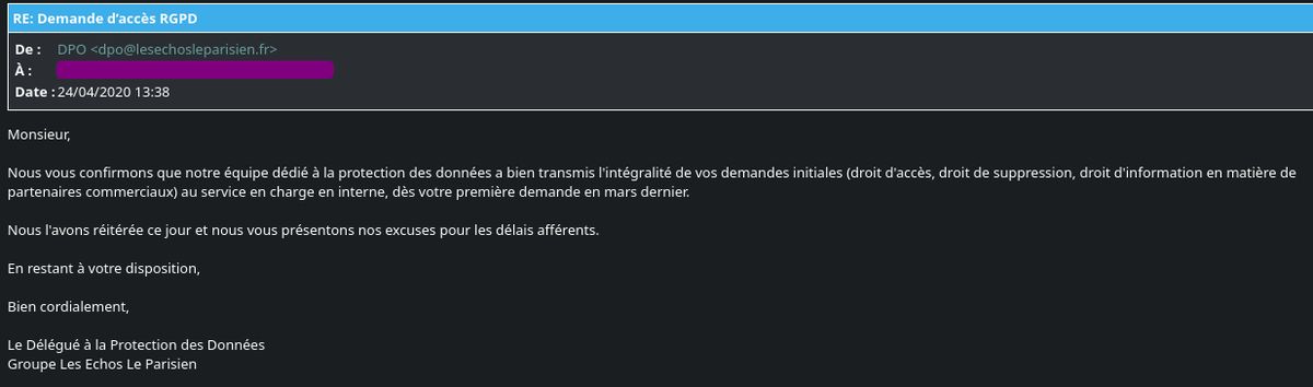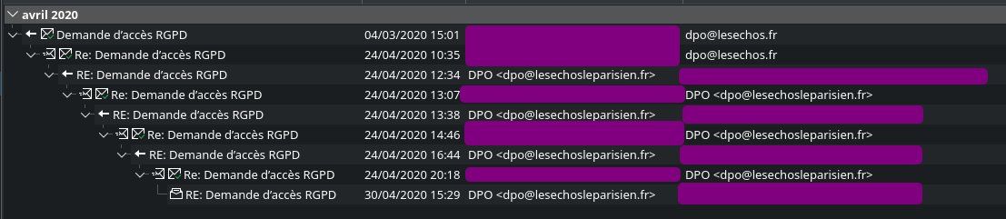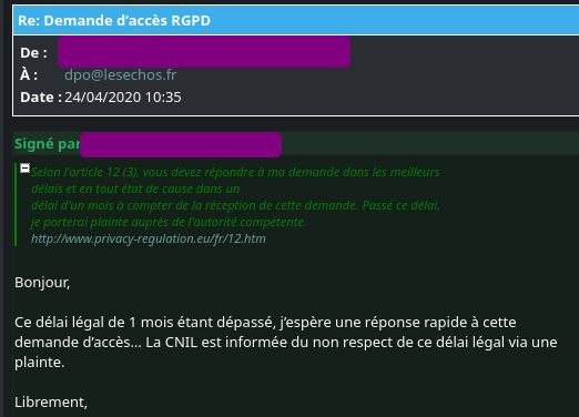 04/02/2020 : Les Échos me démarchent par téléphone, demande d’accès RGPD 24/04/2020 : pas de réponse dans les délais, plainte à la @CNIL et signalement au DPO 24/04/2020 +2h : « oups on est à la bourre » et réponse du DPO (complètement à côté de ses pompes) 26/01/2022 : « c’est