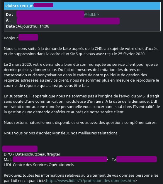 Et vous voyez aussi le boulot juste colossal nécessaire pour un particulier pour réussir à faire exercer ses droits ? Tout conserver pendant 2 ans, relancer régulièrement les intervenants… Là pas de bol, je n’avais pas conservé le SMS reçu… Juste noté le sujet qu’il contenait