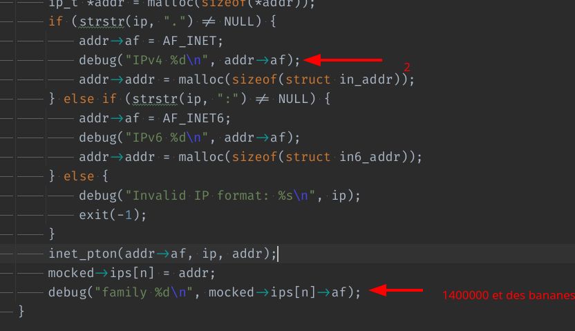 @Keruspe @cyrilamar Bon ça va un peu plus loin, mais la struct semble toujours complètement cramée… J’ai un addr->af = AN_INET, et 3 lignes plus loin il passe à 16777343 quand accédé depuis le mocked->ips[0]->af…