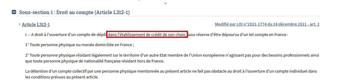 @dadik75 @ZakariszGhent @Wistily @Arcep L’impossibilité d’ouvrir un compte dans un établissement bancaire opérant en France est donc de toute façon en soit poursuivable en justice.