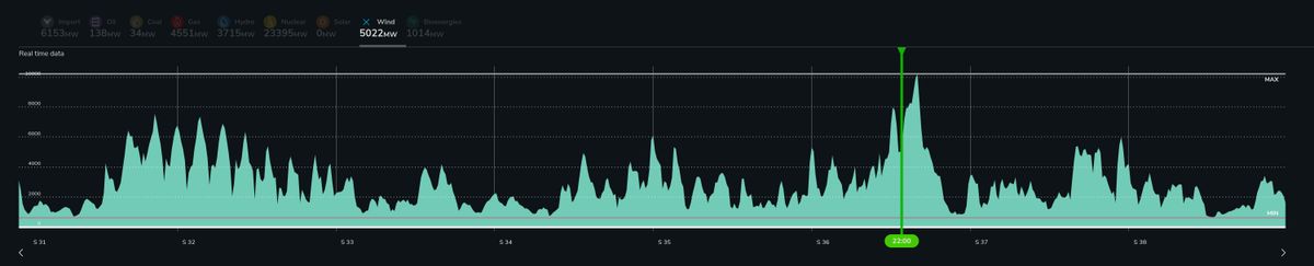 @C_civy @AnagalisArvensi @BzhClair L’éolien est de toute façon en berne depuis plus de 2 mois sur la majeure partie de l’Europe. En France, c’est à peine 2-3GW sur les 18GW du parc depuis début août. On est à plus de 83% de la prod à l’arrêt la majorité du temps.