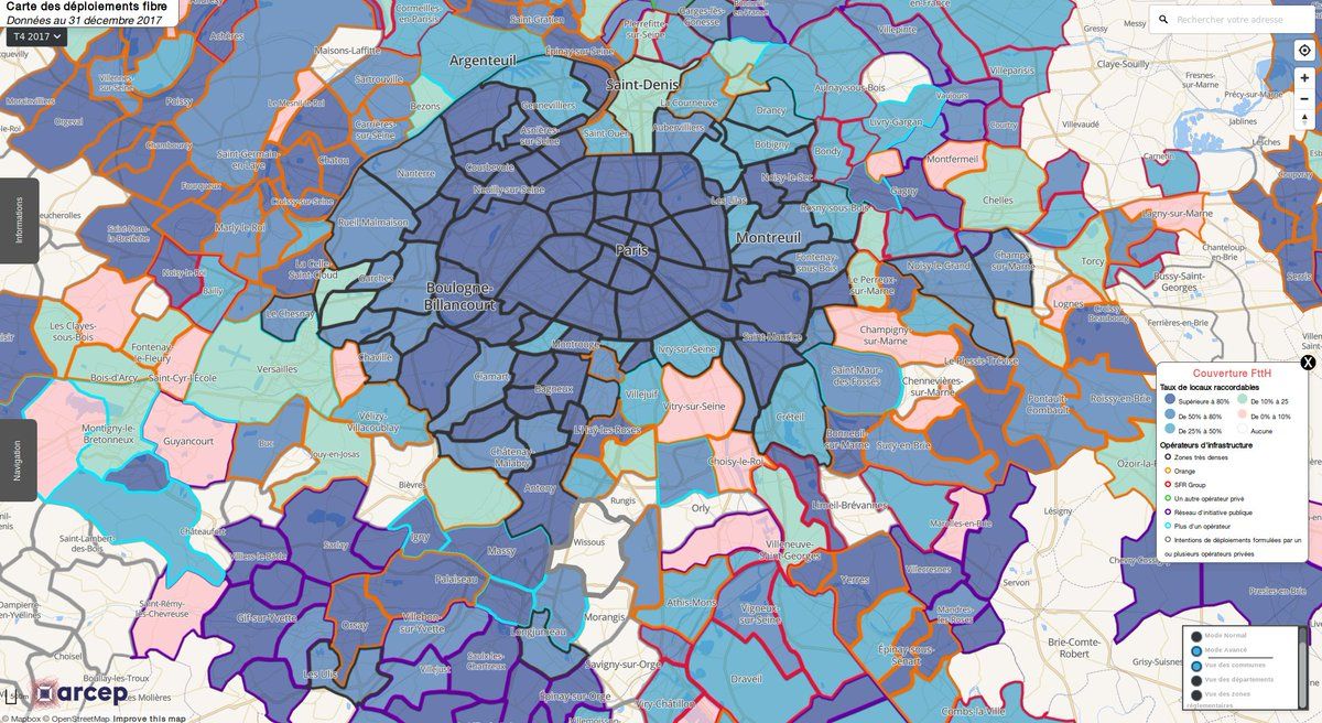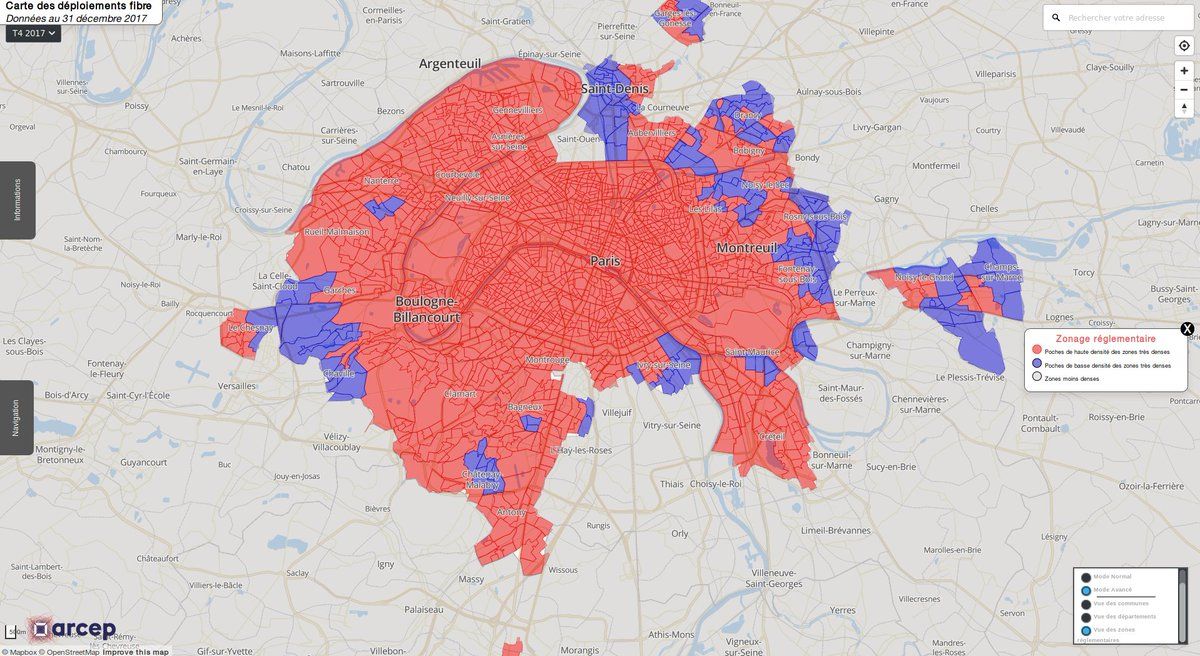 @OpenPrunus @o0o_Zenzla_o0o @bortzmeyer Partout où c’est rouge et bleu, c’est zone dense et donc Free fibre. Ailleurs, c’est de la zone AMII, donc chasse gardée de l’opérateur qui a remporté le marché (Orange ou SFR généralement).